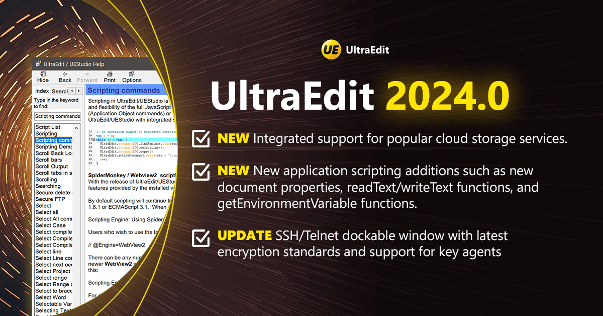 The first UltraEdit release for 2024 brings cloud storage services integration into the editor, more scripting options and properties, and crucial updates to SSH/Telnet features.